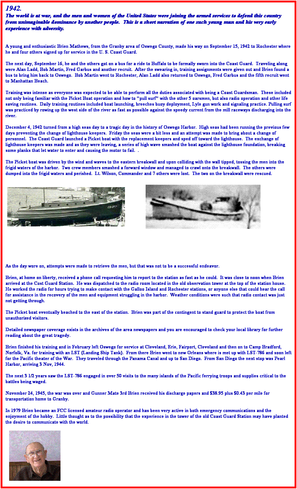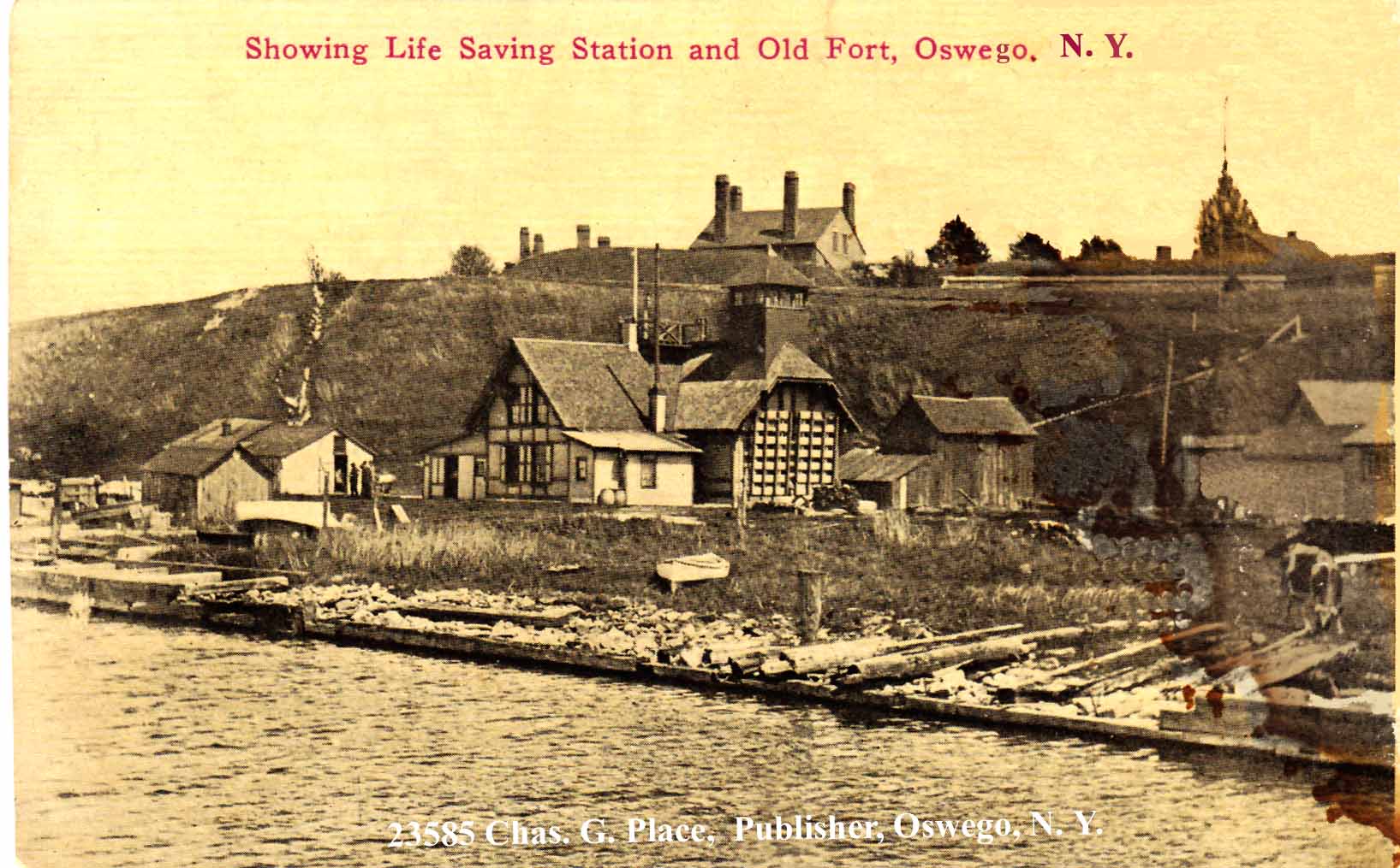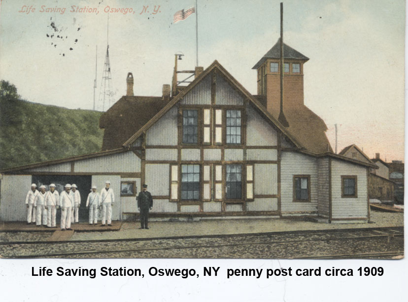 Text Box: Lake Ontario was a welcomed sight for most travelers with its clear blue waters, but when it was angry it was very, very angry.  Ships went down in the fury of the lake and many hands were lost.   In 1784, over in Massachusetts, a ship rescue group was started and became a model for future life saving groups.  In 1807 a boat that was specifically designed to rescue persons from floundering ships came into use.  It carried a crew of 10 that would row out to the ship in trouble to lend as much assistance as it could.  This boat was so popular that they began to show up at other coastal areas.  After the disastrous ship wrecks and loss of life in the winter of 1870-71 Congress earmarked $200,000 to create a life-saving system.  Thus on June 18, 1878 the Life Saving Service came into being under the Treasury Department.  The Treasury Department already oversaw the Revenue Cutter Service, an armed naval force to ensure that proper duty was paid for imported goods.  In 1915 the Life Saving Service, the Revenue Cutter Service, the Lighthouse Service and Steamship Inspection all merged into what is now the U.S. Coast Guard.  A good read about the Life Saving Service can be found at http://beachbum.homestead.com/LifeSaving Stations.htm
